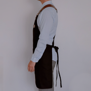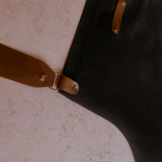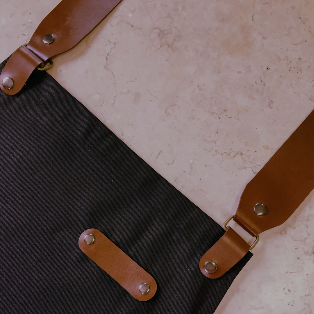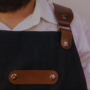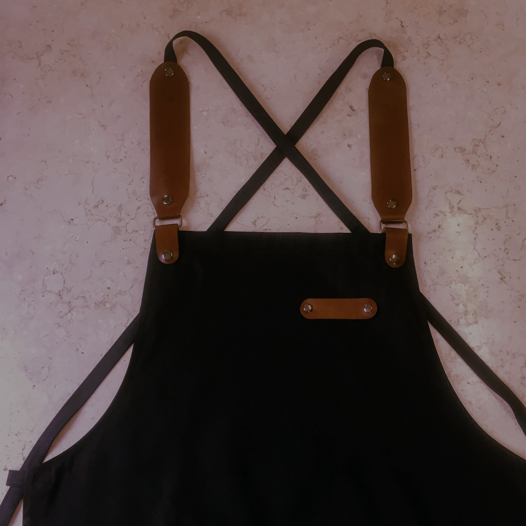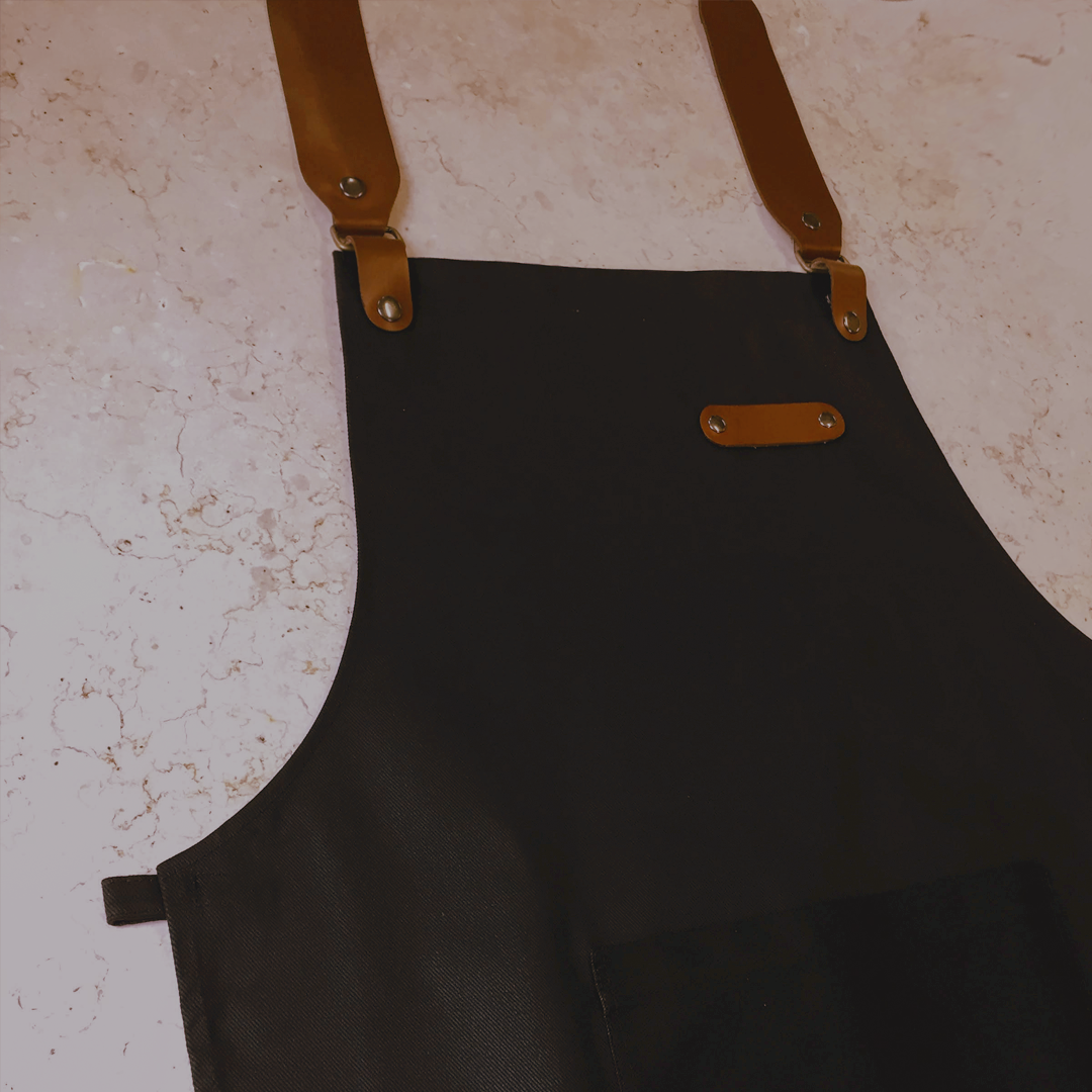 Funcional, los detalles de cuero y tiras pueden retirarse para poder lavar el mandil. Tiene además un gran bolsillo para tener a mano los paños de cocina o utensilios.