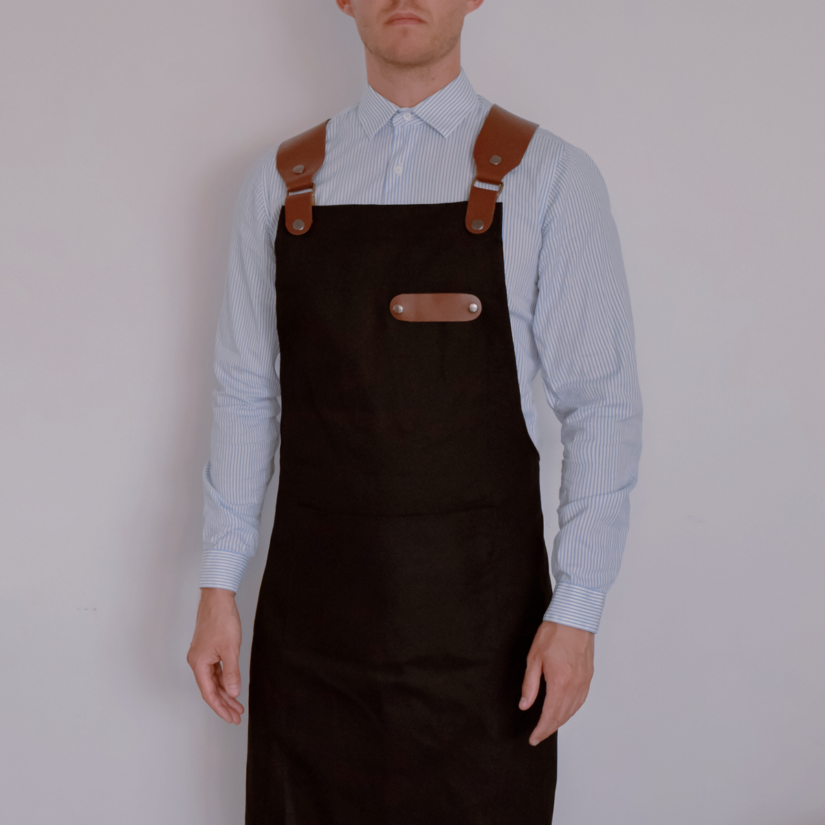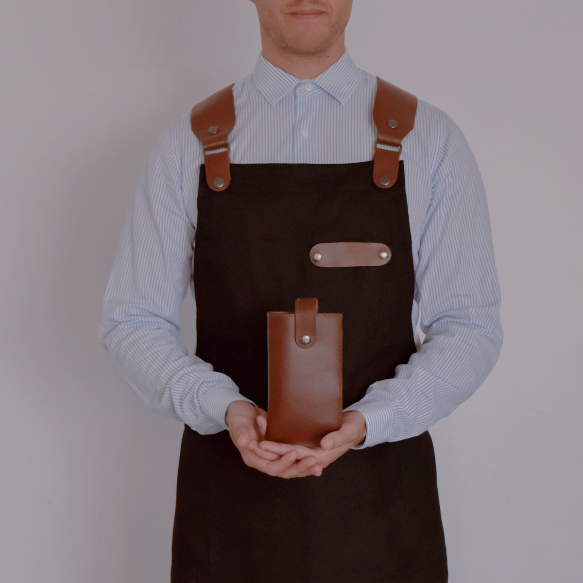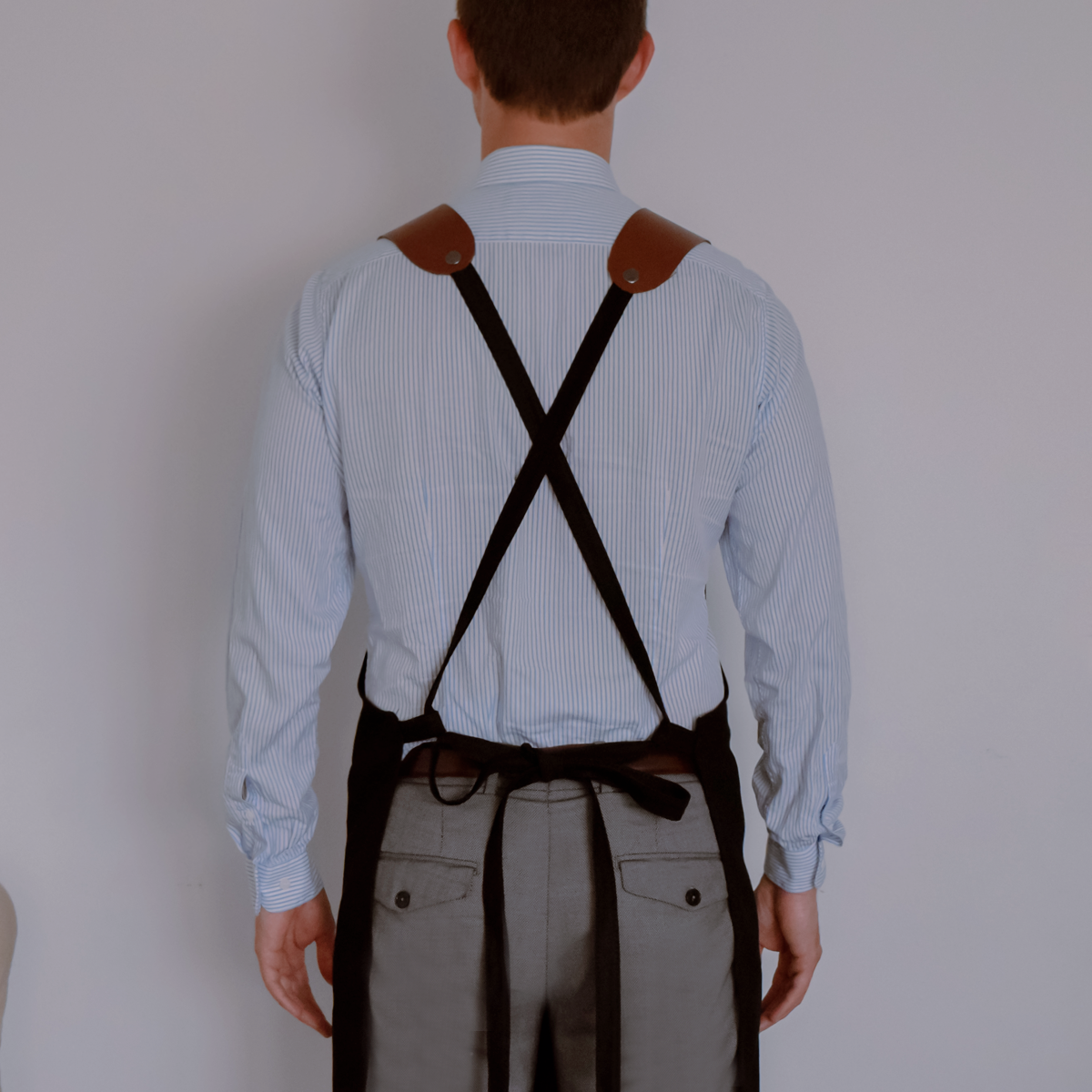 Funcional, los detalles de cuero y tiras pueden retirarse para poder lavar el mandil. Tiene además un gran bolsillo para tener a mano los paños de cocina o utensilios.